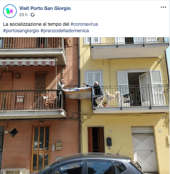 L’immagine è stata condivisa dalla pagina Facebook “Visit Porto San Giorgio” ed è diventata subito virale: un altro scatto che mostra come i balconi siano il simbolo della socializzazione e del modo di stare insieme degli italiani durante la quarantena, “ai tempi del Coronavirus”.