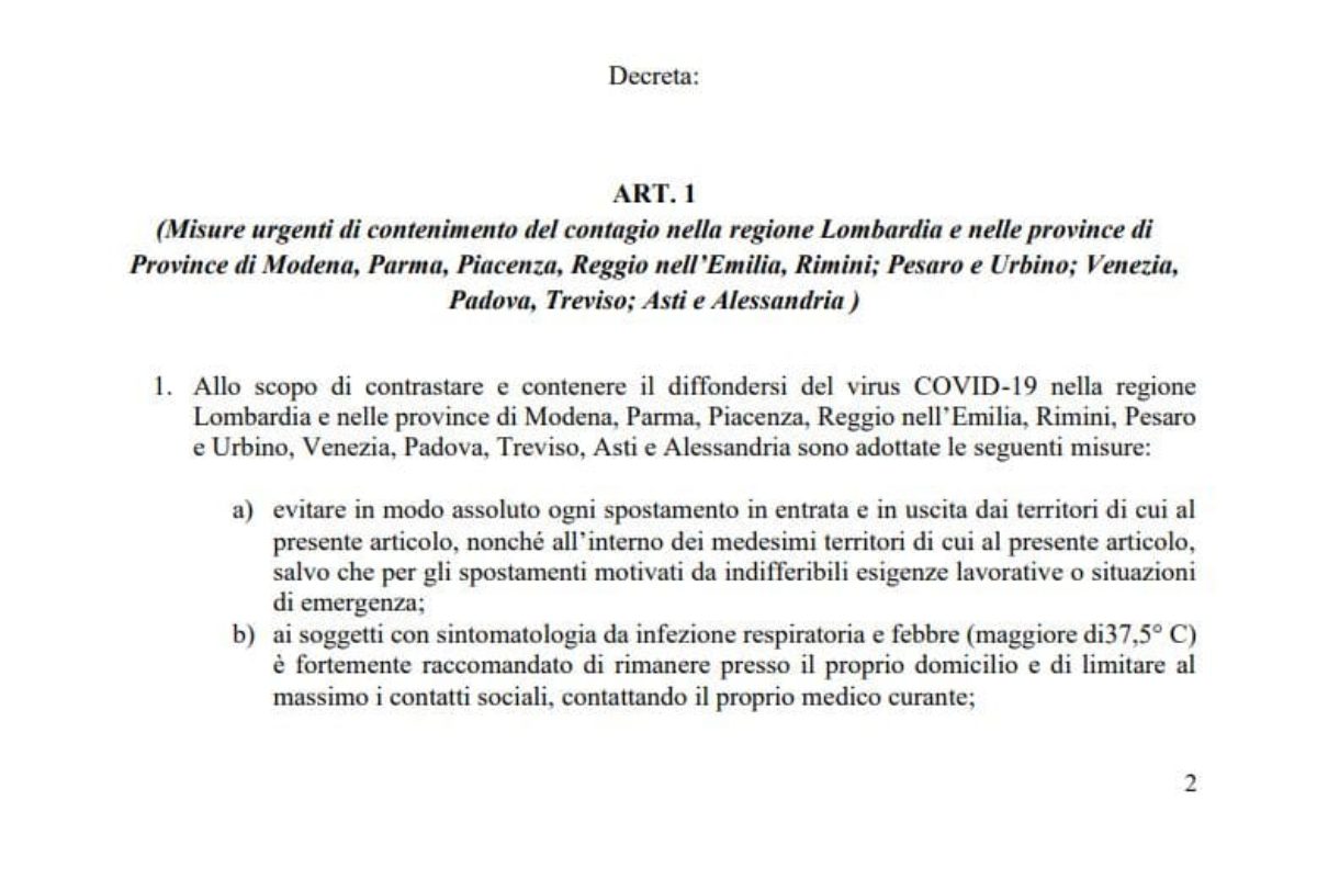 Ore 02,00 – Ecco il decreto: “chiuse” la Lombardia e altre 14 province – Il premier Conte sta illustrando le novità introdotte dal nuovo decreto del Governo: il provvedimento prevede misure fortemente stringenti, tra cui il divieto di ingresso e di uscita, per chi si trovi nella regione Lombardia e in altre 14 province: Modena, Parma, Piacenza, Reggio Emilia, Rimini, Pesaro e Urbino, Venezia, Padova, Treviso, Asti, Alessandria, Vercelli, Novara e Verbano Cusio Ossola. (Qui il testo integrale del decreto).