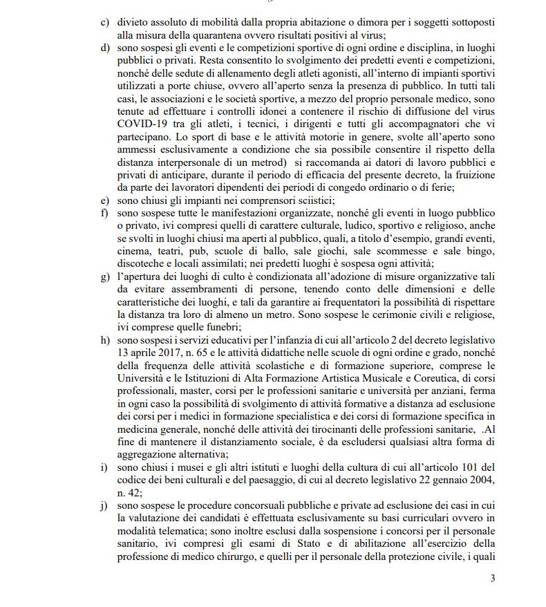 “Sospese anche tutte le manifestazioni organizzate, nonché gli eventi in luogo pubblico o privato, compresi quelli di carattere culturale, ludico, sportivo e religioso, anche se svolti in luoghi chiusi ma aperti al pubblico, come grandi eventi, cinema, teatri, pub, scuole di ballo, sale giochi, sale scommesse e sale bingo, discoteche e locali assimilati”.