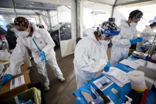 Operatori sanitari effetuano tamponi ad automobilsti in coda al drive in di Tor di Quinto, a Roma, il 31 dicembre. Credit: ANSA/MASSIMO PERCOSSI
