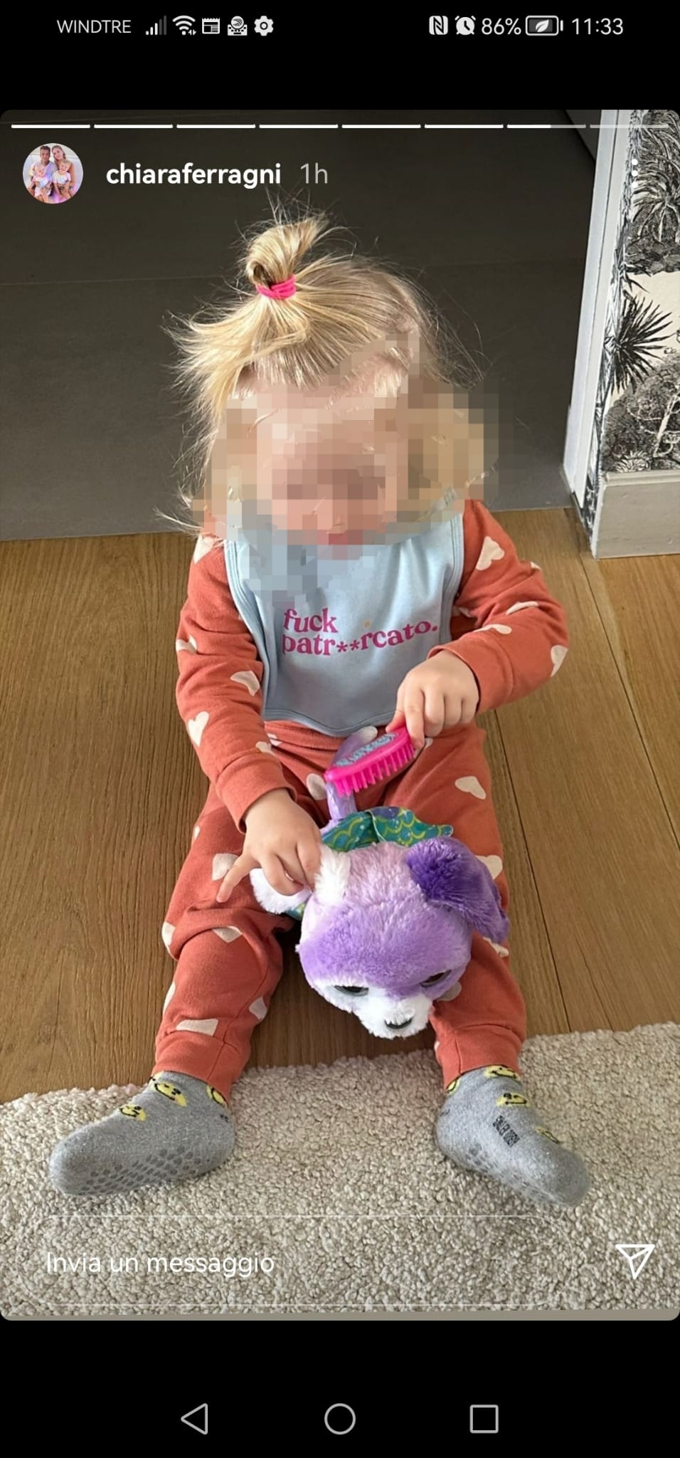Chiara Ferragni avrebbe potuto utilizzare il bavaglino della figlia Vittoria per lanciare un messaggio nascosto. Sulla mini tovaglietta al collo della bambina compare infatti, la scritta: “F*ck patriarcato”. Chiara, anche sul palco di Sanremo, ha infatti portato il messaggio per cui le donne non dovrebbero mai e per nessun motivo sottostare agli uomini. Per molti è però, ciò che è successo a lei nel periodo sanremese: Fedez infatti, le avrebbe più volte rubato la scena fino ad arrivare a baciare Rosa Chemical sul palco durante la finale della kermesse.