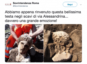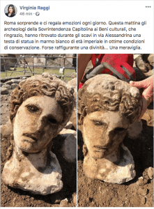 “Roma sorprende e ci regala emozioni ogni giorno. Questa mattina gli archeologi della Sovrintendenza Capitolina ai Beni culturali, che ringrazio, hanno ritrovato durante gli scavi in via Alessandrina una testa di statua in marmo bianco di età imperiale in ottime condizioni di conservazione. Forse raffigurante una divinità…Una meraviglia”.