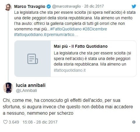 Rispetto ai post su Lucia Annibale ha tenuto a precisare che “non c’era l’intenzione di scherzato sul dramma dell’On. Lucia Annibali o di altre vittime di violenza. Il post su Facebook criticava l’utilizzo strumentale e politico che Annibali faceva della propria vicenda personale per rispondere a un Tweet di Marco Travaglio. La mia era una critica al personaggio pubblico Lucia Annibali per l’uso spregiudicato, strumentale e capzioso di una vicenda personale e drammatica che nulla aveva a che fare con l’osservazione politica di Travaglio. Ne ho dedotto che, secondo la logica di Annibali, non si potesse più parlare di acido in sua presenza, ed era un modo ironico per mettere in luce la scorrettezza della deputata”.
