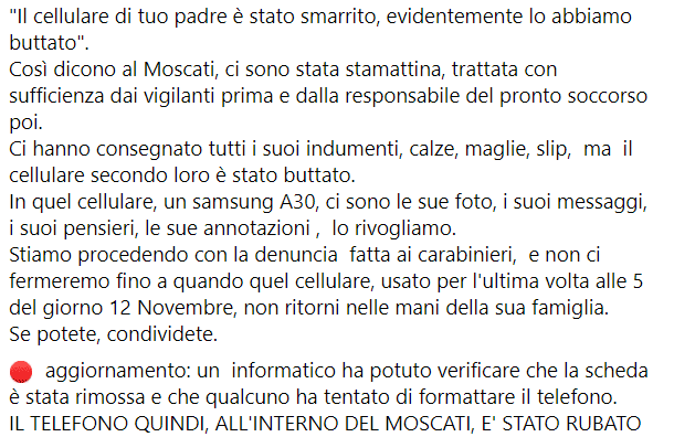 Ha perso il padre a causa del Covid ma, una volta raccolti i suoi effetti personali in ospedale, la donna ha scoperto che il cellulare era stato rubato. Ha chiesto quindi spiegazioni, ma le è stato risposto che probabilmente era stato gettato via. Venere Rotelli, attrice e operatrice sociale di Massafra, ha allora trovato sfogo su Facebook raccontando l’accaduto. “Mentre mio padre moriva gli è stato rubato il cellulare”, ha dichiarato l’attrice. “Ci hanno consegnato tutti i suoi indumenti, calze, maglie, slip, ma il cellulare secondo loro è stato buttato. In quel cellulare, un samsung A30, ci sono le sue foto, i suoi messaggi, i suoi pensieri, le sue annotazioni , lo rivogliamo. Stiamo procedendo con la denuncia fatta ai carabinieri, e non ci fermeremo fino a quando quel cellulare, usato per l’ultima volta alle 5 del giorno 12 Novembre, non ritorni nelle mani della sua famiglia”.