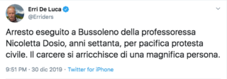 “Arresto eseguito a Bussoleno della professoressa Nicoletta Dosio, anni settanta, per pacifica protesta civile. Il carcere si arricchisce di una magnifica persona”, aveva scritto Erri De Luca su Twitter alla notizia dell’arresto.