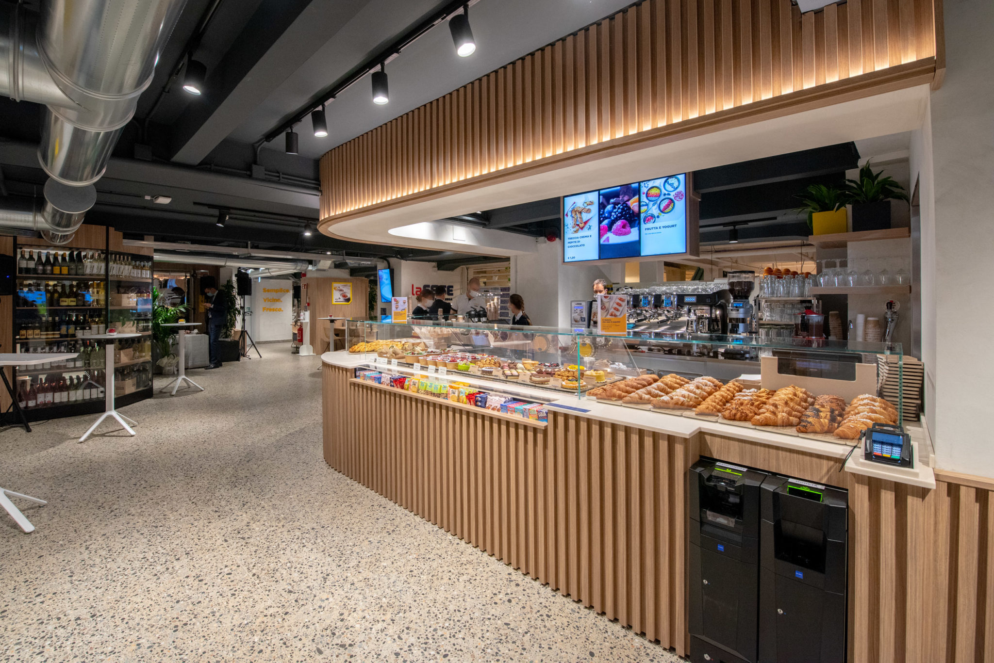 L’enoteca propone una selezione di oltre 300 etichette di vini e grazie al servizio di prenotazione l’offerta si estende a oltre 760 etichette, tutte provenienti dalle cantine più prestigiose d’Italia e del mondo, con una particolare attenzione per i vini del territorio. Sarà presente un sommelier per orientare i clienti nella scelta. La caffetteria, con la sua cucina a vista, offre piatti caldi e freddi, specialità preparate al momento ed Elisenda, l’alta pasticceria di Esselunga che coniuga ingredienti di altissima qualità, artigianalità e creatività dei maestri pasticceri, realizzata in collaborazione con gli chef stellati, i fratelli Cerea.