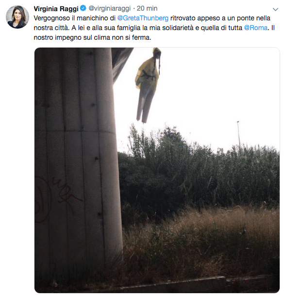 Sul posto è intervenuta la polizia, mentre la sindaca di Roma Virginia Raggi ha condannato il gesto scrivendo sul suo profilo Twitter: “Vergognoso il manichino di Greta Thunberg ritrovato appeso a un ponte nella nostra città. A lei e alla sua famiglia la mia solidarietà e quella di tutta Roma. Il nostro impegno sul clima non si ferma”.