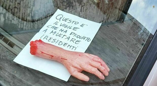 Protesta goliardica o minaccia da temere? Ieri mattina gli abitanti del centro di Fermo si sono trovati di fronte a una scena a dir poco bizzarra: un braccio insanguinato appoggiato sul cofano di una macchina. “Questo è il vigile che ha provato a multare i residenti”, la scritta che accompagnava il braccio mozzato, ovviamente di gomma.