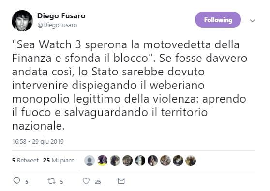 “‘Sea Watch 3 sperona la motovedetta della Finanza e sfonda il blocco’. Se fosse davvero andata così, lo Stato sarebbe dovuto intervenire dispiegando il weberiano monopolio legittimo della violenza: aprendo il fuoco e salvaguardando il territorio nazionale”, scrive Diego Fusaro.