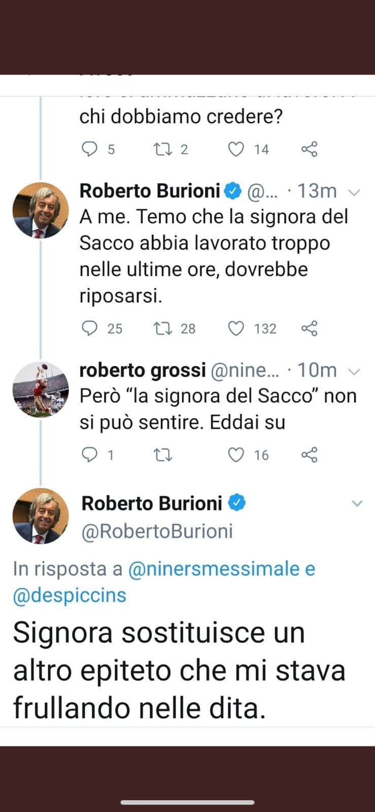 Ieri poi la Gismondo aveva pubblicato delle statistiche che avrebbero dovuto rassicurare sulla scarsa pericolosità del virus. Burioni, che invece ha una posizione molto più allarmistica, ha contestato quelle cifre e a chi su twitter gli ha domandato “A chi dobbiamo credere?” ha risposto con quel “La signora del Sacco” e “sostituisce un altro epiteto che mi stava frullando nelle dita”.