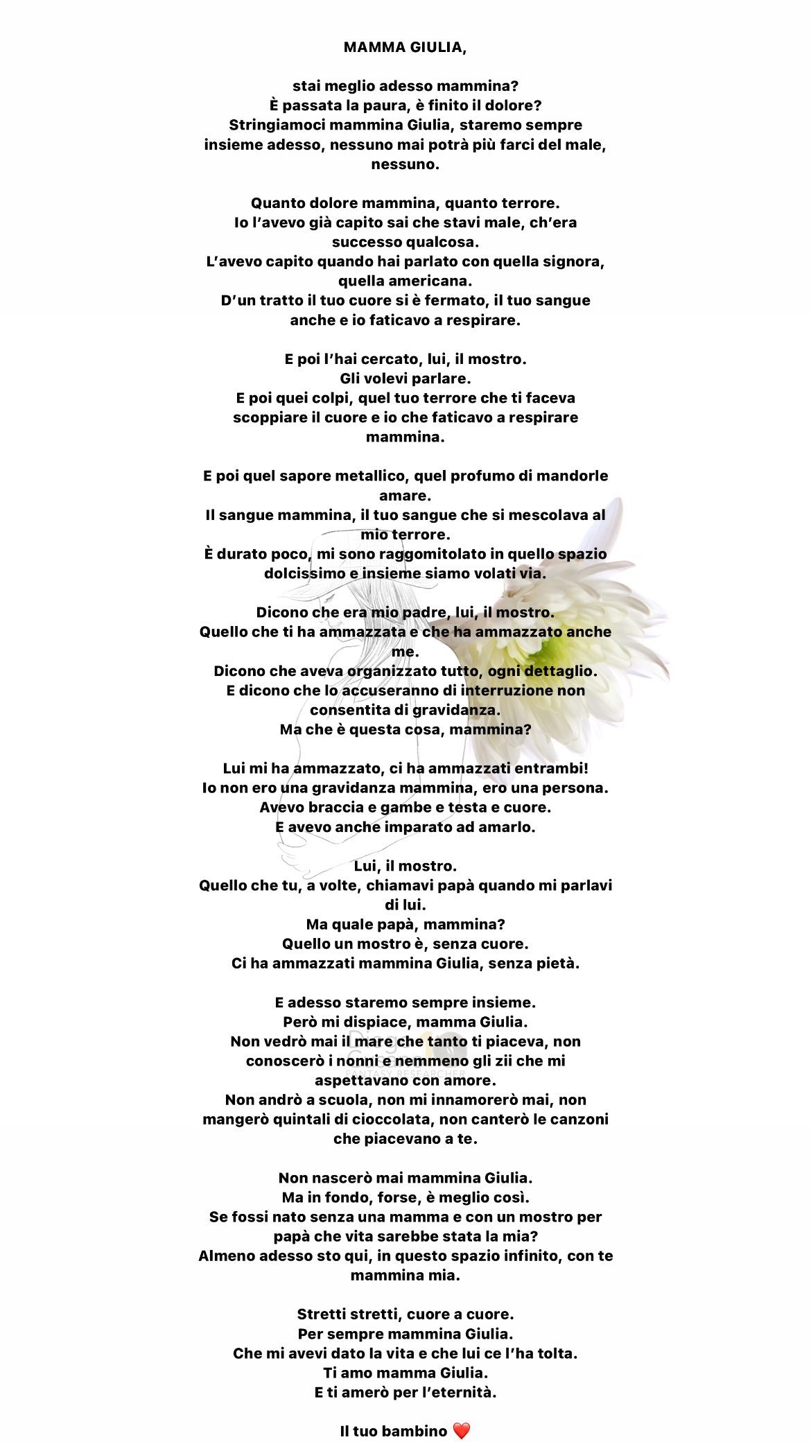 La missiva, quindi, si conclude: “Almeno adesso sto qui, in questo spazio infinito, con te mammina mia. Stretti stretti, cuore a cuore. Per sempre mammina Giulia. Che mi avevi dato la vita e lui ce l’ha tolta. Ti amo mamma Giulia. E ti amerò per l’eternità”.