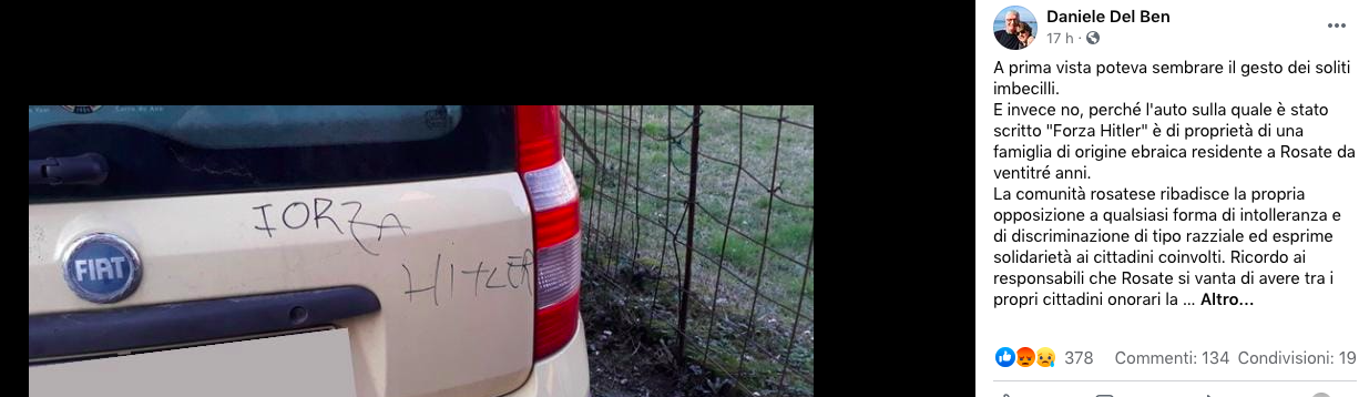 “A prima vista poteva sembrare il gesto dei soliti imbecilli. E invece no, perché l’auto sulla quale è stato scritto ‘Forza Hitler’ è di proprietà di una famiglia di origine ebraica”, le parole, amare, del primo cittadino. Che ha raccontato anche che la famiglia finita nel mirino è “residente a Rosate da ventitré anni”.