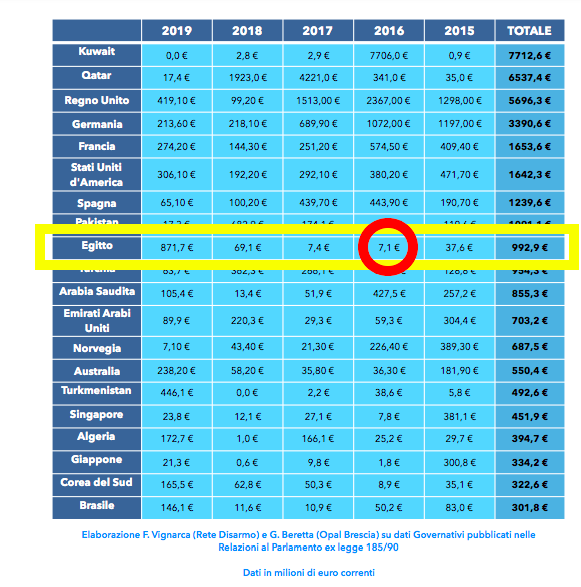Dopo nemmeno un anno, sul piano dei rapporti diplomatici tornava un’armonia perfetta: incontri bilaterali sempre più fitti, forniture di armi, formazione, scambi commerciali ai massimi livelli. Al termine di ogni incontro, ovviamente il rito ipocrita del “ho ricordato al mio interlocutore la vicenda di Giulio Regeni”. Forniture di armi, appunto, che dal 2017 in poi subiscono un’incredibile impennata.