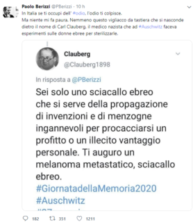 A postare gli insulti è stato un account fittizio antisemita che si rifà al medico nazista Carl Clauberg