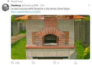 Nell’account Twitter Clauberg 1898 , insieme all’hastag #Giornatadella Memoria 2020 viene postata l’immagine di un forno a legna da giardino con il titolo “La casa lussuosa della Senatrice a vita ebrea Liliana Segre”.