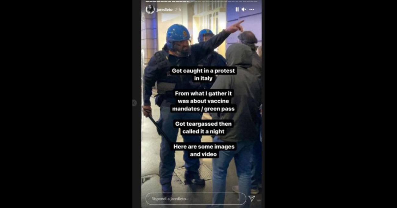 Jared Leto si trovava nelle del centro di Roma durante gli scontri scoppiati sabato scorso a seguito della manifestazione contro l’obbligo del green pass. “Sono finito in una protesta a Roma. Da quello che capisco era sull’obbligo di vaccini e il green pass. Sono stato colpito dai lacrimogeni e sono andato via”, ha scritto il vincitore del premio Oscar in una story sul suo profilo Instagram, dove ha documentato quanto stava accadendo con video e foto.