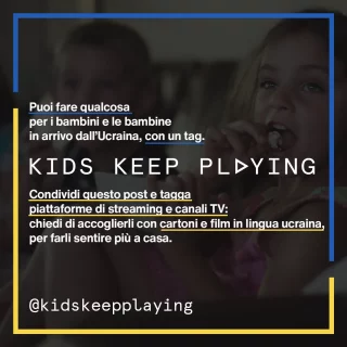 È nato sui social un movimento senza scopo di lucro per chiedere ai grandi dello streaming di mettere a disposizione anche contenuti in lingua ucraina sul territorio italiano. Il 13 marzo 2022 il primo risultato è stato raggiuto: Netflix Italia ha reso disponibile in lingua ucraina cartoni animati e film. L’idea nasce in maniera spontanea: nella grande mobilitazione che si sta giustamente creando a sostegno dell’Ucraina, c’è un dettaglio che non è ancora stato preso in considerazione e che potrebbe comunque essere di sostegno? Il collettivo che ha dato vita a KIDS KEEP PLAYING ha cercato di trovare la risposta provando a immedesimarsi nei bambini e nelle bambine che cercano riparo dalla guerra: una volta arrivati in Italia, dopo avere mangiato, dopo avere avuto accesso a una doccia, a un letto pulito… quale potrebbe essere un momento di distrazione – per quanto possibile – da tutto quello che hanno vissuto e stanno vivendo?