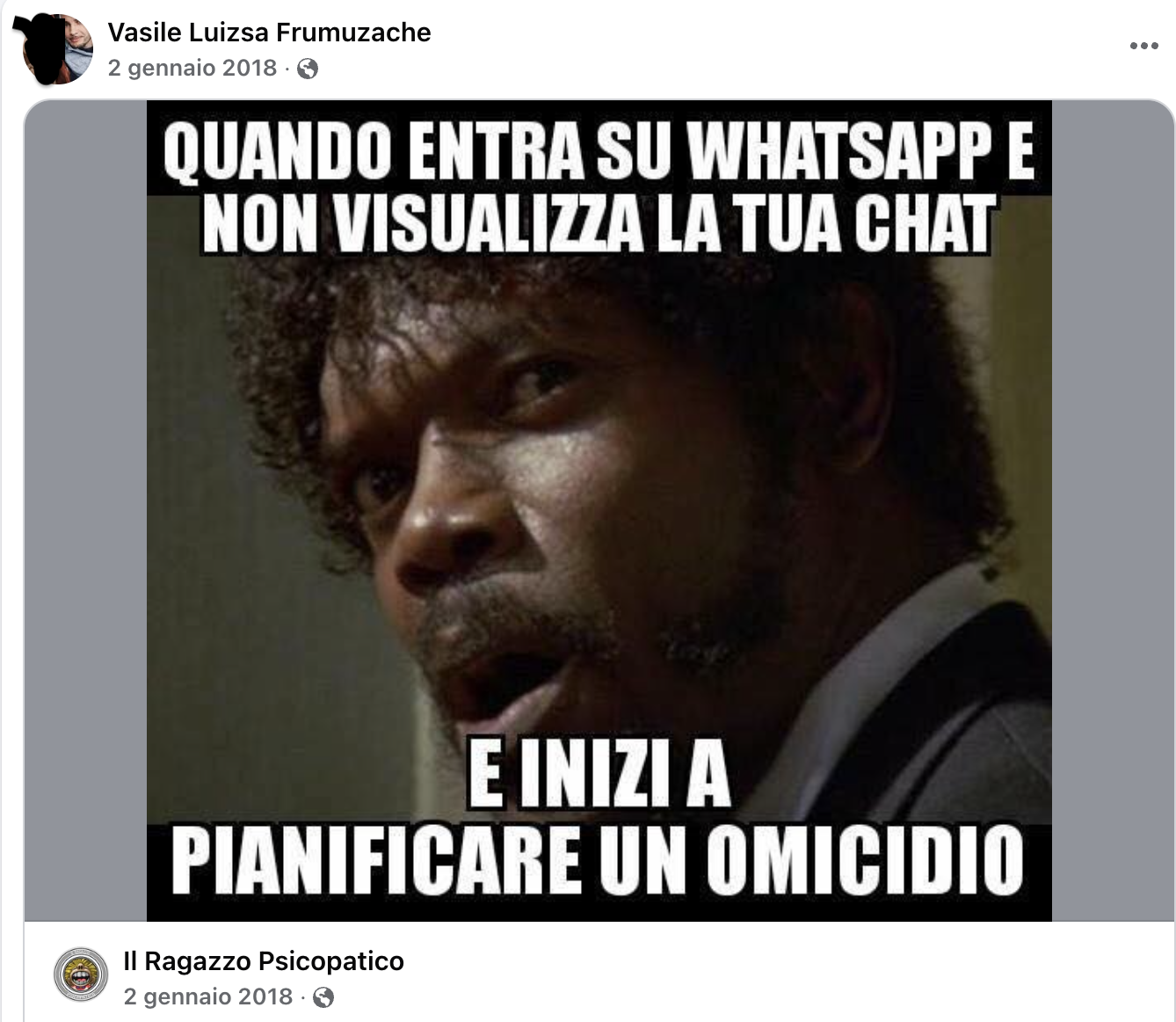 Vasile Frumuzache, la guardia giurata 32enne che ha confessato l’omicidio di due escort, Denisa Maria Adas e Ana Maria Andrei, aveva una vita apparentemente tranquilla. Il suo profilo Facebook, peraltro condiviso con la moglie Luizsa, è contornato di foto che lo ritraggono sorridente con la sua consorte e i suoi figli, che oggi hanno 4 e 5 anni. Eppure, tornando indietro a ritroso, sulla sua bacheca c’è un post, datato 2018, che il 32enne ha condiviso sui social e che oggi, alla luce di quanto scoperto, fa venire i brividi. Si tratta di un meme, ricondiviso da un gruppo Facebook, che recita: “Quando entra su WhatsApp e non visualizza la chat, e inizi a pianificare un omicidio”. È un post apparentemente ironico ma che riletto oggi assume i contorni di una premonizione agghiacciante.