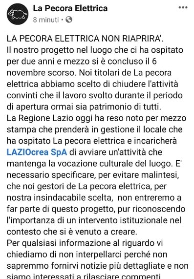 “La pecora elettrica non riaprirà”, hanno specificato tuttavia i proprietari in un post Facebook. “La Regione Lazio oggi ha reso noto per mezzo stampa che prenderà in gestione il locale che ha ospitato La pecora elettrica e incaricherà LAZIOcrea SpA di avviare un’attività che mantenga la vocazione culturale del luogo. E’ necessario specificare, per evitare malintesi, che noi gestori de La pecora elettrica, per nostra insindacabile scelta, non entreremo a far parte di questo progetto, pur riconoscendo l’importanza di un intervento istituzionale nel contesto che si è venuto a creare”.