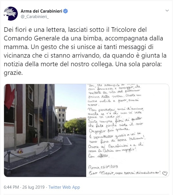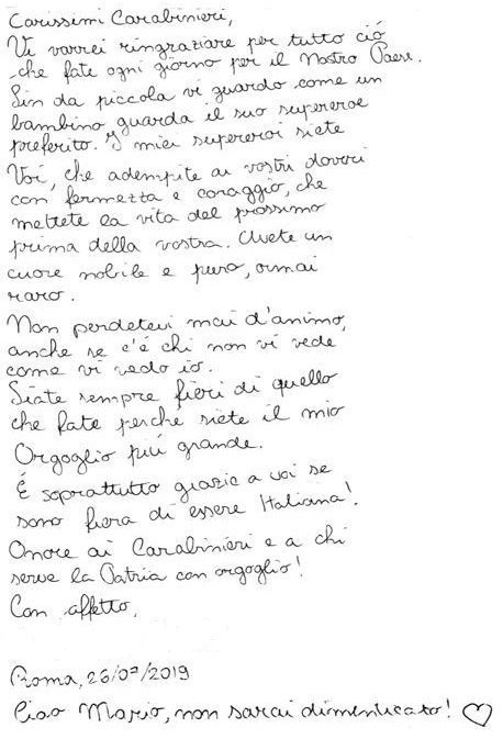 E ancora: “Non perdetevi mai d’animo, anche se c’è chi non vi vede come vi vedo io. Siate sempre dieri di quello che fate perché siete il mio orgoglio più grande. E soprattutto grazie a voi se sono fiera di essere italiana” Onore ai Carabinieri e a chi serve la Patria con orgoglio! Con affetto. Roma, 26/07/2019″. E infine: “Ciao Mario, non sarai dimenticato”, ha scritto la bambina.