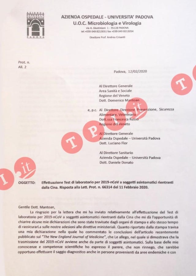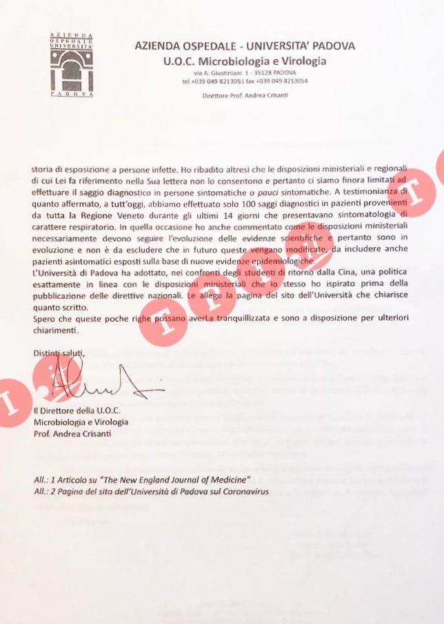 In effetti Andrea Crisanti me la invia, perché non ha nulla da nascondere. La lettera, datata 12 febbraio 2020 e inviata dal professor Crisanti al direttore generale Domenico Mantoan nonché alla stessa dottoressa Francesca Russo, non contiene alcuna ritrattazione. Anzi. Crisanti scrive proprio che non rinnega la sua posizione sulla potenziale contagiosità degli asintomatici e cita un articolo a supporto della sua tesi. Allo stesso tempo però rassicura Mantoan del fatto che i 100 tamponi eseguiti da lui entro il 12 febbraio, erano stati fatti a persone rientrate dalla Cina, ma sintomatiche o pauci sintomatiche (in realtà, invece, ha violato le regole, come riporta oggi anche il Corriere). Infine, aggiunge: “Non è da escludere che in futuro le disposizioni ministeriali verranno modificate, così da includere anche pazienti asintomatici. Spero di averla tranquillizzata”.