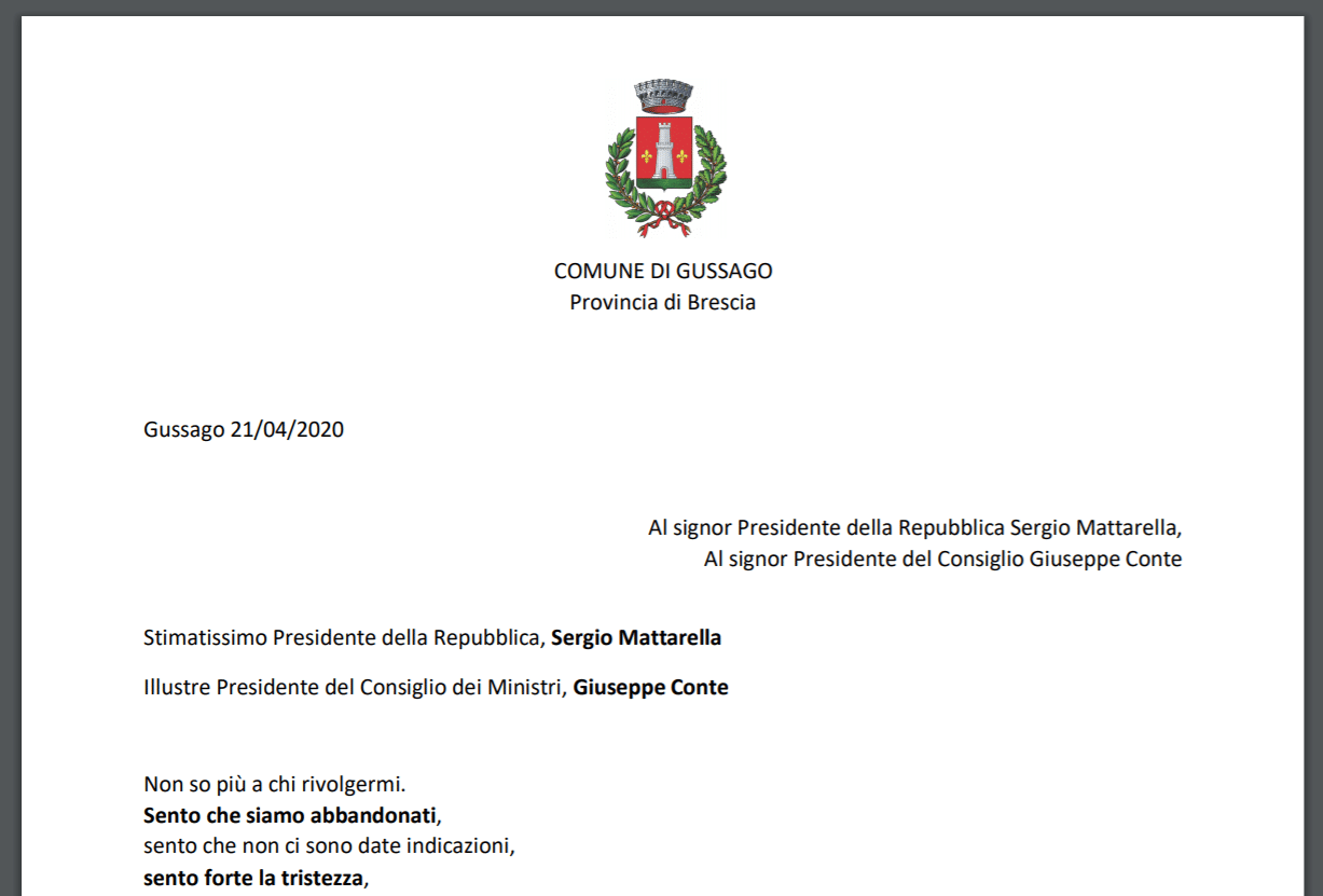 Il numero totale delle vittime ufficiali in Lombardia è ad oggi di oltre 12.500 persone. “Non so più a chi rivolgermi”, esordisce il sindaco di Gussago. “Sento che siamo abbandonati, sento che non ci sono date indicazioni, sento forte la tristezza, sento lo sconforto di quelli che voi chiamate numeri, ma che in realtà sono i miei concittadini, che uno dopo l’altro se ne stanno andando”.