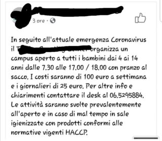 In alcuni casi le ludoteche specificano che riceveranno solo un numero limitato di bambini o addirittura che agiranno “in assoluta osservanza delle disposizioni ministeriali”, ma di fatto aggirano il divieto lucrando sulle difficoltà delle famiglie che non sanno a chi lasciare i propri figli.