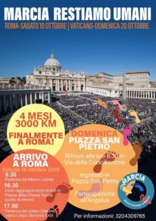 Domenica 20 ottobre, invece, i partecipanti hanno fissato un appuntamento alle ore 9 in Piazza San Pietro per la partecipazione all’Angelus di Papa Francesco, a cui consegneranno una lettera di sostegno e solidarietà, insieme al Manifesto della Marcia “Restiamo Umani”.