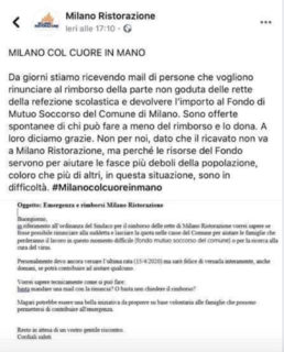 Milano Ristorazione SpA pubblica i messaggi di tanti genitori che chiedono di devolvere i soldi a loro spettanti all'iniziativa di solidarietà organizzata dal Sindaco Beppe Sala