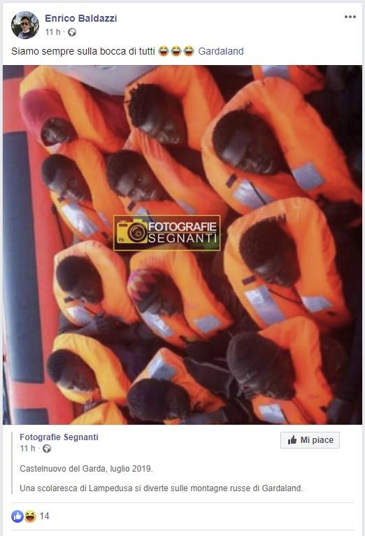 Migranti a Gardaland, sulle montagne russe. È l’ultimo, irriverente, accostamento della pagina satirica “Fotografie segnanti” che abbina una foto di rifugiati su un barcone, con il giubbotto di salvataggio addosso, con la didascalia “Castelnuovo del Garda, luglio 2019. Una scolaresca di Lampedusa si diverte sulle montagne russe di Gardaland“.