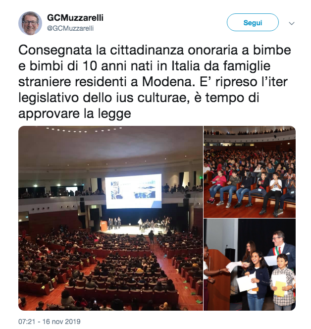 Il sindaco di Modena Gian Carlo Muzzarelli ieri, 16 novembre 2019, ha conferito la cittadinanza onoraria modenese a 216 bambini figli di stranieri. “Noi oggi anticipiamo il Parlamento”, le parole del primo cittadino (Pd) durante la cerimonia.