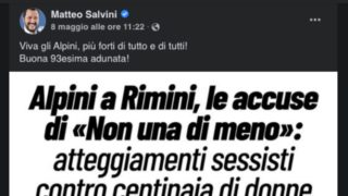 “Viva gli alpini, più forti di tutti e tutto, buona 93esima adunata“, scrive Matteo Salvini sulla sua pagina Facebook in vista del raduno annuale degli Alpini a Rimini. Un post in cui non ci sarebbe niente di controverso se non fosse che il commento accompagna il titolo del Corriere della Sera che riporta gli abusi degli alpini denunciati da decine di donne a ridosso dell’evento. Le testimonianze sono state raccolte dalle attiviste di Non una di meno Rimini: le vittime hanno parlato di palpeggiamenti, molestie, commenti inappropriati, molti sul luogo di lavoro e a discapito di minorenni.