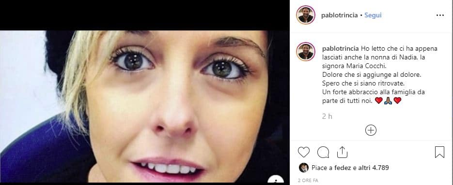 “Ho letto che ci ha appena lasciati anche la nonna di Nadia, la signora Maria Cocchi. Dolore che si aggiunge al dolore. Spero che si siano ritrovate. Un forte abbraccio alla famiglia da parte di tutti noi”.