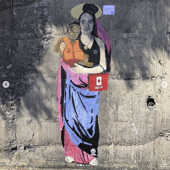 “Santa Carola protettrice dei rifugiati“, questo il titolo assegnato dallo street artist all’opera, affissa in Via Crocefisso, a Taormina, nella stessa strada dove campeggiano i murale dedicati a Mahmood e ad Andrea Camilleri.