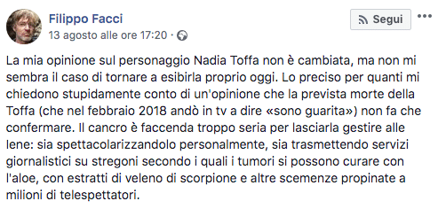 “La mia opinione sul personaggio Nadia Toffa non è cambiata, ma non mi sembra il caso di tornare a esibirla proprio oggi. Lo preciso per quanti mi chiedono stupidamente conto di un’opinione che la prevista morte della Toffa (che nel febbraio 2018 andò in tv a dire ‘sono guarita’) non fa che confermare”, osserva Facci. “Il cancro è faccenda troppo seria per lasciarla gestire alle Iene: sia spettacolarizzandolo personalmente, sia trasmettendo servizi giornalistici su stregoni secondo i quali i tumori si possono curare con l’aloe, con estratti di veleno di scorpione e altre scemenze propinate a milioni di telespettatori”.