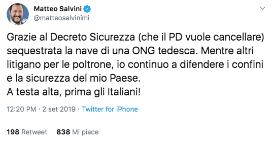 La Guardia di Finanza ha disposto il sequestro della nave poco prima che attraccasse a Pozzallo e, di fatto, ha autorizzato così lo sbarco dei migranti. “Grazie al Decreto Sicurezza (che il Pd vuole cancellare) sequestrata la nave di una Ong tedesca. Mentre altri litigano per le poltrone, io continuo a difendere i confini e la sicurezza del mio Paese. A testa alta, prima gli Italiani!”, ha twittato Salvini.