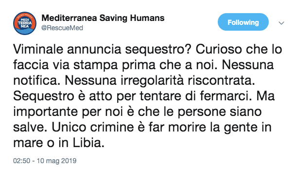 “Sequestro è atto per tentare di fermarci. Ma importante per noi è che le persone siano salve. Unico crimine è far morire la gente in mare o in Libia”, si legge in un tweet pubblicato dalla Ong.