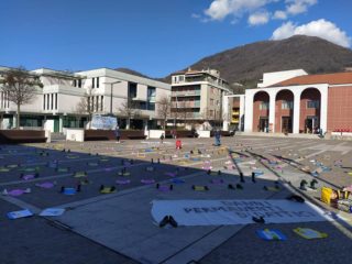 Famiglie, bambini e adulti hanno scritto su pezzi di stoffa il loro dissenso contro la Dad. La protesta pacifica contro la sospensione delle lezioni in presenza è stata realizzata posando i messaggi accompagnati dalle scarpe.