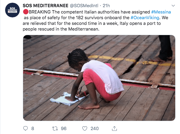 “Uomini, donne e bambini stanno soffrendo per le condizioni meteorologiche avverse”, era stato l’appello di Sos Méditerranée che chiedeva un porto di sbarco. “Un salvataggio è completato quando i naufraghi sono stati sbarcati”.