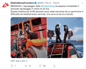 “Abbiamo appena completato il secondo salvataggio in meno di 24 ore”, scrivono le Ong su Twitter. “Più di 80 persone sono state salvate da un gommone in difficoltà nel Mediterraneo centrale questa mattina e ora sono al sicuro a bordo”.