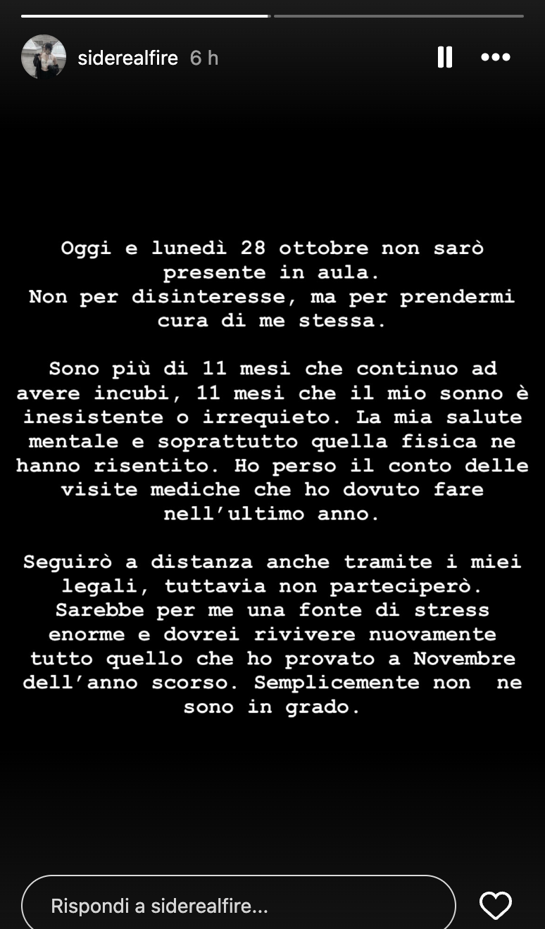 A spiegare il perché è stata la stessa ragazza attraverso le stories del suo profilo Instagram. “Oggi non sarò presente in aula non per disinteresse, ma per prendermi cura di me stessa. Sono più di undici mesi che continuo ad avere incubi, undici mesi che il mio sonno è inesistente o irrequieto. La mia salute mentale e soprattutto quella fisica ne hanno risentito. Ho perso il conto delle visite mediche che ho dovuto fare nell’ultimo anno”.