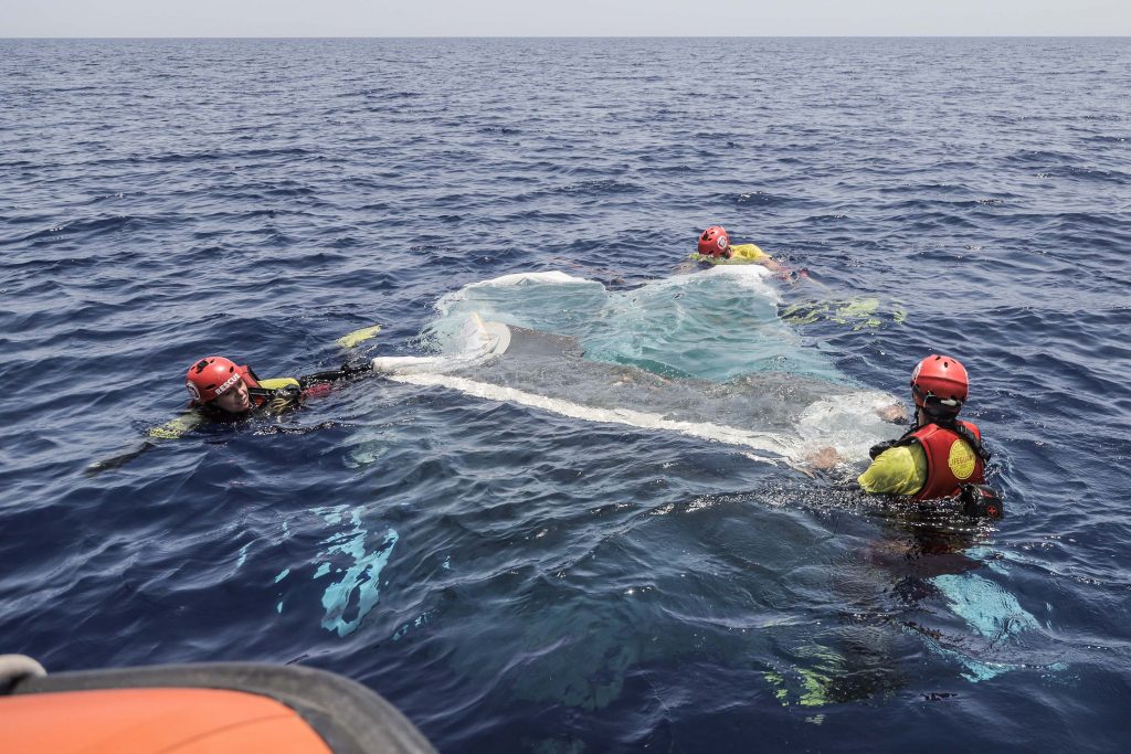 Scendiamo con un gommone e ci avviciniamo, corpi in superficie non se ne vedono ma il gommone è arrotolato su se stesso. È grande, credo una decina di metri, il motore non c’è. Forse sono passati i trafficanti a prenderlo, come fanno dopo ogni “soccorso” della sedicente Guardia Costiera Libica.