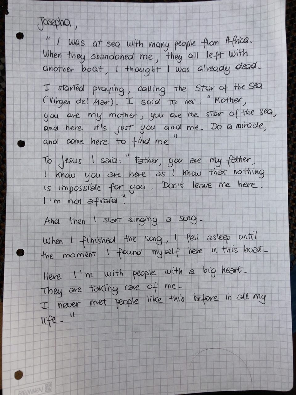 Josepha pregava proprio la Madonna, lo ha raccontato con estrema difficoltà a Giovanna Scaccaborozzi, dottoressa di bordo che ha avuto l’onere di certificare la morte delle altre due persone che erano con Josepha, ma anche di scrivere quello che la donna appena salvata raccontava. Poche parole e tante polemiche.