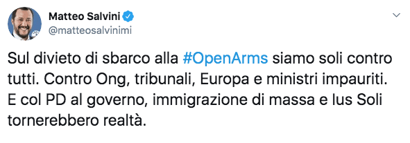 Il braccio di ferro coinvolge anche il premier Giuseppe Conte, che in tarda mattinata ha scritto una durissima lettera rivolta proprio contro Salvini in cui lo accusa di “sleale collaborazione” e parla del caso Open Arms. “Francia, Germania, Romania, Portogallo, Spagna e Lussemburgo mi hanno appena comunicato di essere disponibili a redistribuire i migranti”, sottolinea il premier. “Ancora una volta, i miei omologhi europei ci tendono la mano. Siamo ormai agli sgoccioli di questa nostra esperienza di governo. Abbiamo lavorato fianco a fianco per molti mesi e ho sempre cercato di trasmetterti i valori della dignità del ruolo che ricopriamo e la sensibilità per le istituzioni che rappresentiamo”.