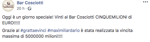 “Oggi è un giorno speciale! Vinti al Bar Cosciotti CINQUEMILIONI di EURO!!!!”, ha scritto la titolare sulla pagina Facebook dell’attività.