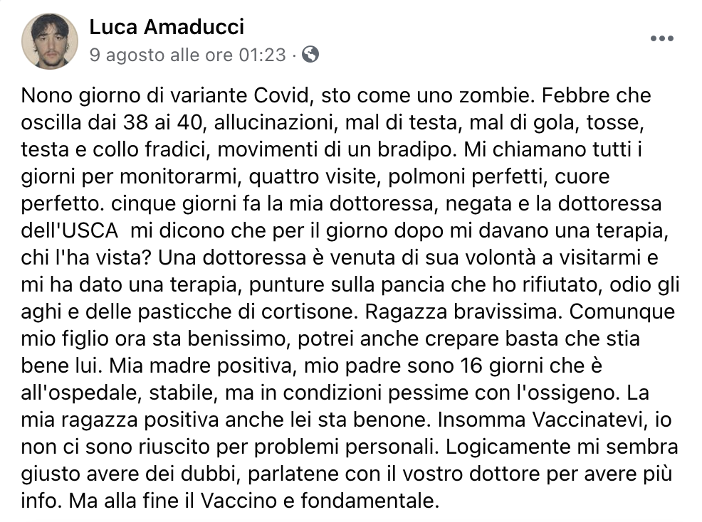 Nell’ultimo post, datato 9 agosto, l’uomo, che lascia un figlio, scriveva: “Nono giorno di variante Covid, sto come uno zombie. Febbre che oscilla dai 38 ai 40, allucinazioni, mal di testa, mal di gola, tosse, testa e collo fradici, movimenti di un bradipo. Mi chiamano tutti i giorni per monitorarmi, quattro visite, polmoni perfetti, cuore perfetto. cinque giorni fa la mia dottoressa, negata e la dottoressa dell’USCA mi dicono che per il giorno dopo mi davano una terapia, chi l’ha vista? Una dottoressa è venuta di sua volontà a visitarmi e mi ha dato una terapia, punture sulla pancia che ho rifiutato, odio gli aghi e delle pasticche di cortisone. Ragazza bravissima”.