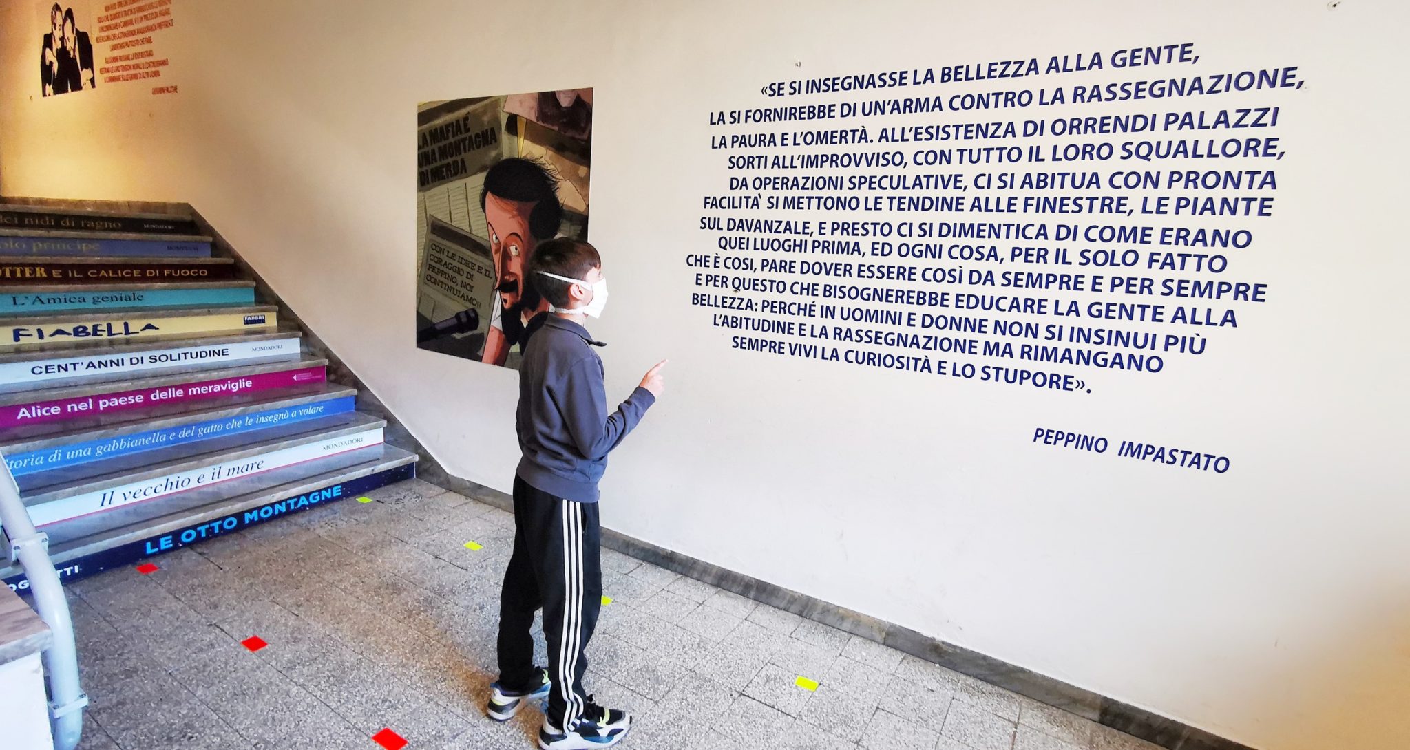 “Il senso del bello è ciò che mantiene viva la curiosità, la meraviglia, lo stupore. La capacità di emozionarsi e di stupirsi davanti alla bellezza. Per fortuna esistono i libri. Ogni pagina di un libro è una scoperta, una magica sensazione che ci travolge proprio come la capacità e la forza di un seme nel diventare un albero secolare. Secolari come le idee di Peppino Impastato e il suo inno alla bellezza, come le idee di Falcone e Borsellino, omaggiati ogni anno in occasione della giornata contro le mafie, purtroppo non celebrata tutti insieme quest’anno a causa del Covid, ma presenti da oggi e per sempre, sulle pareti della nostra scuola”.