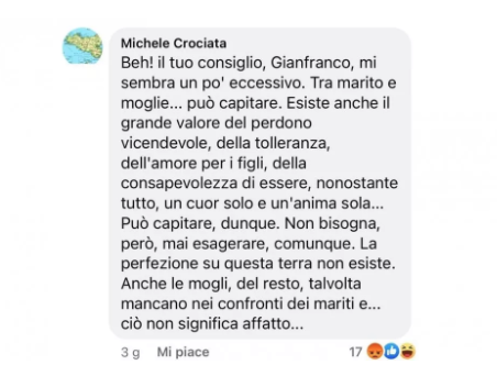 Dopo pochi minuti comparire il commento di Crociata al post del giornalista: “Beh! il tuo consiglio, Gianfranco, mi sembra un po’ eccessivo. Tra marito e moglie… può capitare. Esiste anche il grande valore del perdono vicendevole, della tolleranza, dell’amore per i figli, della consapevolezza di essere, nonostante tutto, un cuor solo e un’anima sola… Può capitare, dunque. Non bisogna, però, mai esagerare, comunque. La perfezione su questa terra non esiste. Anche le mogli, del resto, talvolta mancano nei confronti dei mariti e… ciò non significa affatto… bisogna accettare…via!!!!!! non esageriamo!!! Esistono, infatti, anche le virtù, che tutti siamo chiamati a sforzarci di praticare. Nel matrimonio, infatti, le virtù contano più dell’amore. Quando si è fidanzati, lui vive per lei e lei vive per lui. Quando, però, ci si sposa, l’amore da solo non basta più e servono maggiormente le virtù e lui e lei vivono, soprattutto, per i figli”.