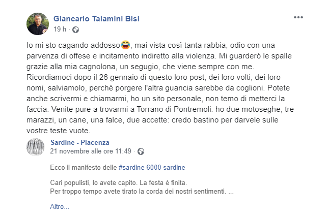 E in un altro commento si lancia in un’invettiva contro i partecipanti del movimento, che sta espandendosi a macchia d’olio. “Sto guardando Piazza Pulita e l’intervista ai 3 sfigati delle Sardine. Sono molto giovani, la menano con l associazionismo e, quel che è peggio, son precari e disoccupati, girano per l Italia a cercare un lavoro. Io, se fossi in loro, piangerei per la loro condizione , mi cercherei un lavoro stabile, non perderei tempo a fare il coglione in giro e credere alle favole”, scrive in un commento.