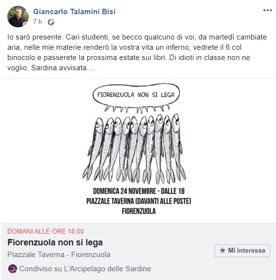 Sta creando polemiche nelle ultime ore il post di un insegnante leghista di Fiorenzuola che ha minacciato i suoi studenti di “rendere la loro vita un inferno” se li avesse sorpresi a manifestare con le sardine.